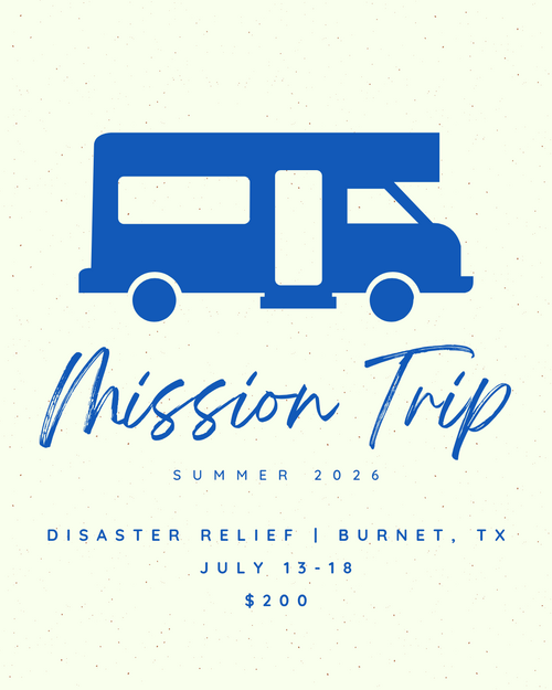 Our Youth Mission Trip will focus on disaster relief in Burnet. Students will have the opportunity to serve communities in need through hands-on work, offering practical help and sharing Christ’s love in tangible ways. This trip is designed to grow students in compassion, teamwork, and faith as they step outside their comfort zones and make a meaningful impact.
